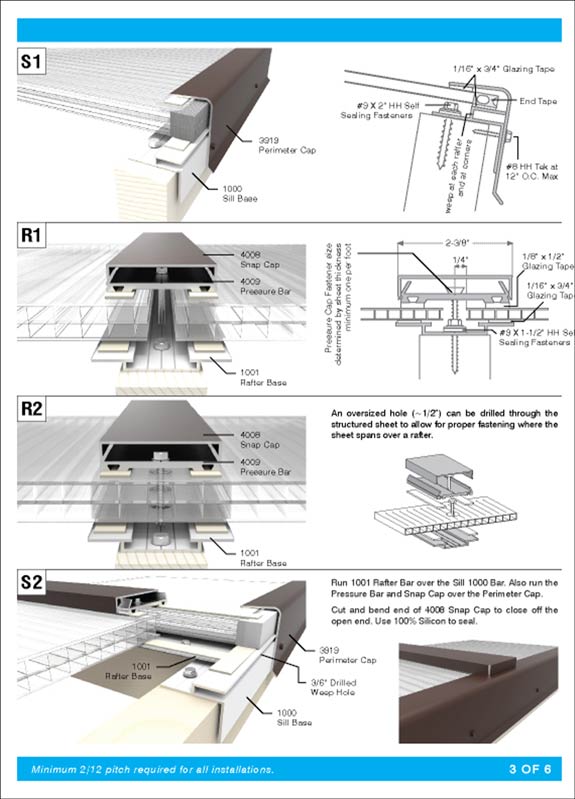 Fasteners must be anchored through the base frame to the base structure to adequately accommodate snow / wind loads. Fasteners must be used at every lineal foot.