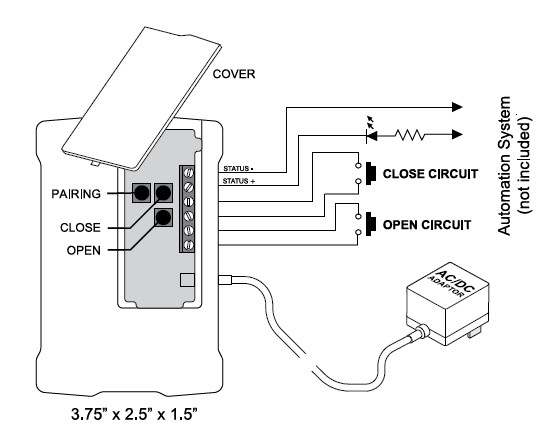 The ECI Box requires momentary contact closure of 0.5 seconds to execute an open or close command. Refer to the wiring diagram for further information on the wiring requirements. The ECI Box requires a standard wall outlet to be utilized as well.